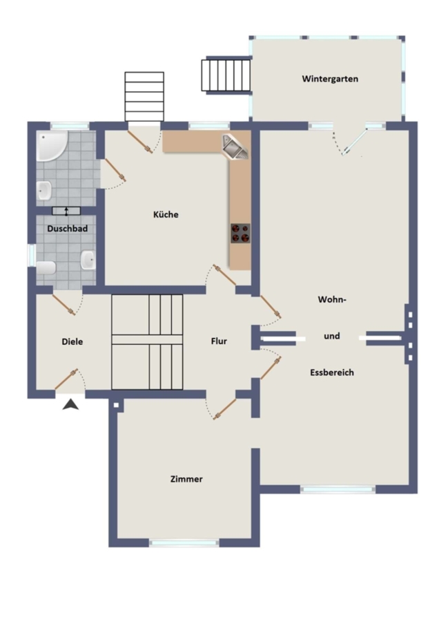 Des Weiteren verfügt das Erdgeschoss über eine geschlossene Einbauküche mit Zugang zum Garten und ein weiteres, großzügiges Zimmer sowie ein Duschbadezimmer.