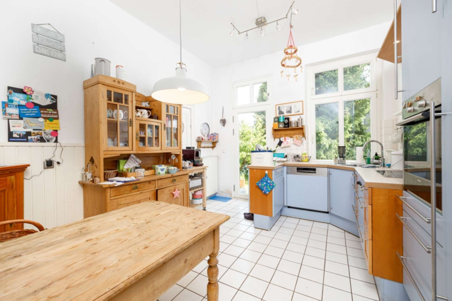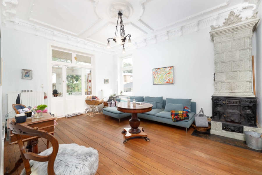 Die Villa verfügt über 7 Zimmer mit ca. 3 Meter hohen Decken, welche mit originalem Stuck versehen sind und Ihnen viel Platz und Freiraum bieten. Die Pitchpine-Böden, die Holz-Türen, der beeindruckende Kachelofen im Wohnbereich und die massiven Holztreppen, sind hervorragend erhalten und stammen allesamt aus dem Baujahr 1900 und verleihen der Villa einen ganz besonderen Charme.