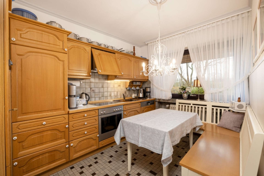 Sie betreten das gepflegte Einfamilienhaus über die Diele mit angrenzendem Gäste-WC. Von hier aus erreichen Sie das Herzstück des Hauses. Den offenen und großen Wohn- und Essbereich mit großzügigen Fensterfronten sowie Zugang zur sonnigen Süd-Terrasse. Die Küche ist hier offen zum Wohnbereich gestaltet, lässt sich aber bei Bedarf mit einer Schiebetür schließen.