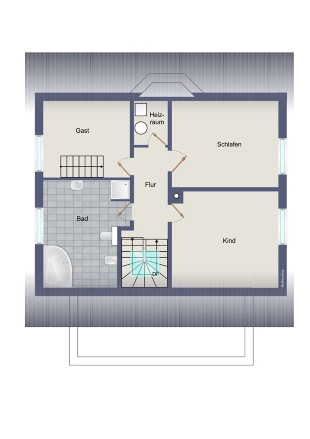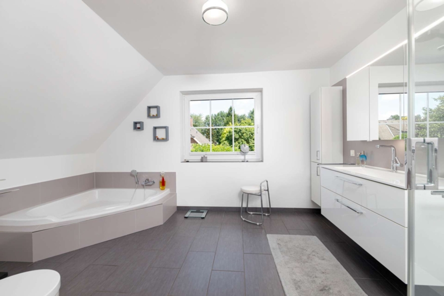 - Bädergestaltung: Ein Gäste-WC im Erdgeschoss, ein großes Vollbad im Dachgeschoss