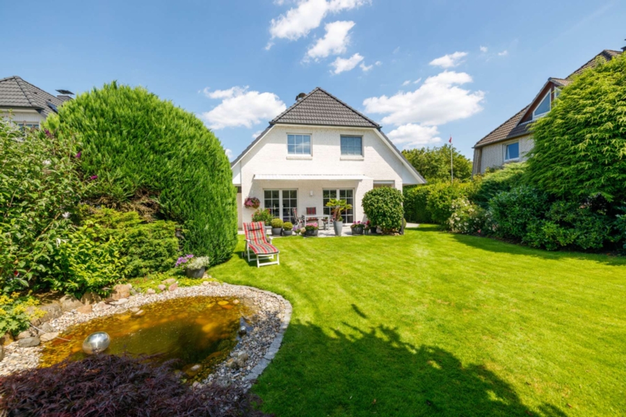 Der Garten wurde mit viel Liebe angelegt und lädt dazu ein, die Natur zu genießen. Ein Teich schafft eine entspannte Atmosphäre und bietet einen beruhigenden Anblick. Die teilweise überdachte Süd-Terrasse ermöglicht es Ihnen, die Sonne in vollen Zügen zu genießen.